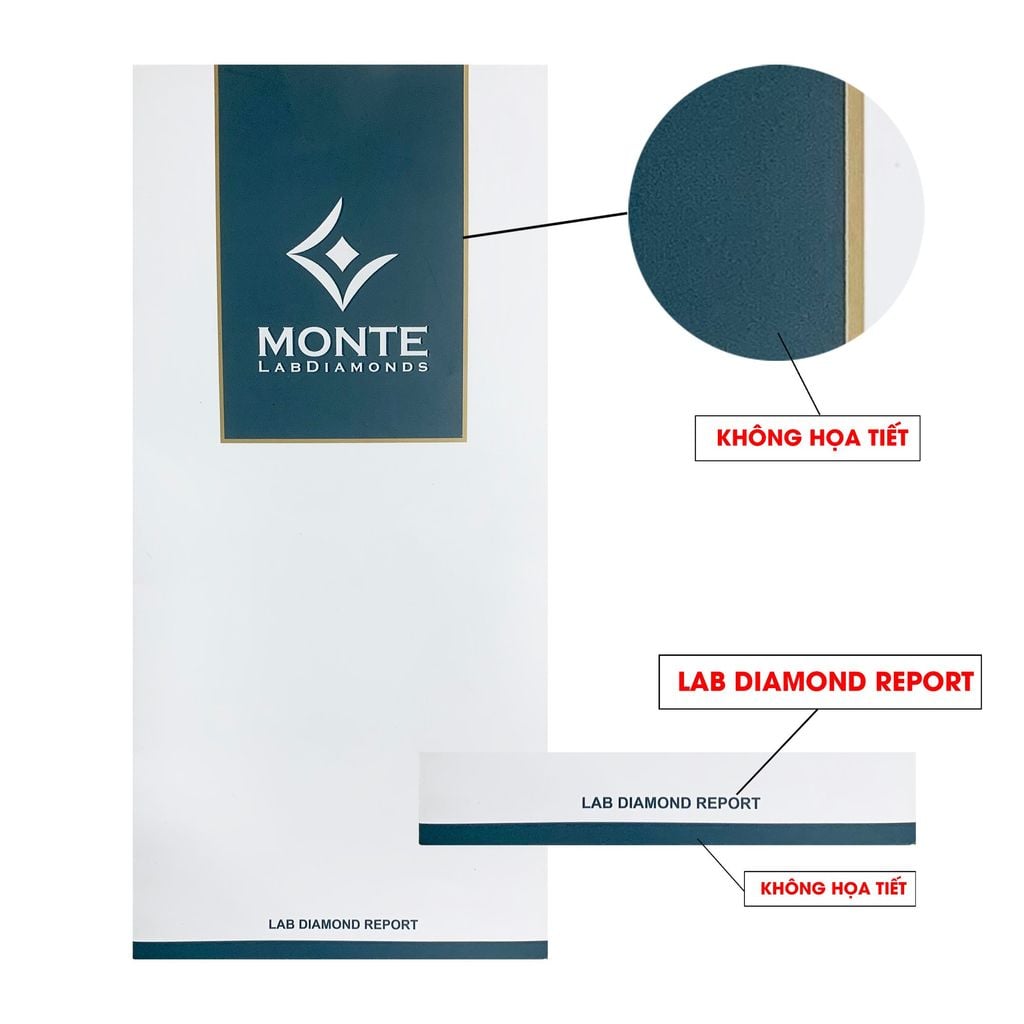 - Giấy certificate: Giấy của Monte Lab Grown Diamond khác so với giấy của Monte Moissanite (DEF và GH) ở họa tiết và chữ trên trang bìa. Bạn có thể xem chi tiết tại 2 hình ảnh dưới đây